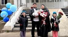 Расул и Амина Магомедовы нарекли сына Мухаммадом. Защитник Отечества приехал в больницу на выписку. Старшие сёстры, 8-летняя Хадижа и 7-летняя Марям, также порадовались брату.