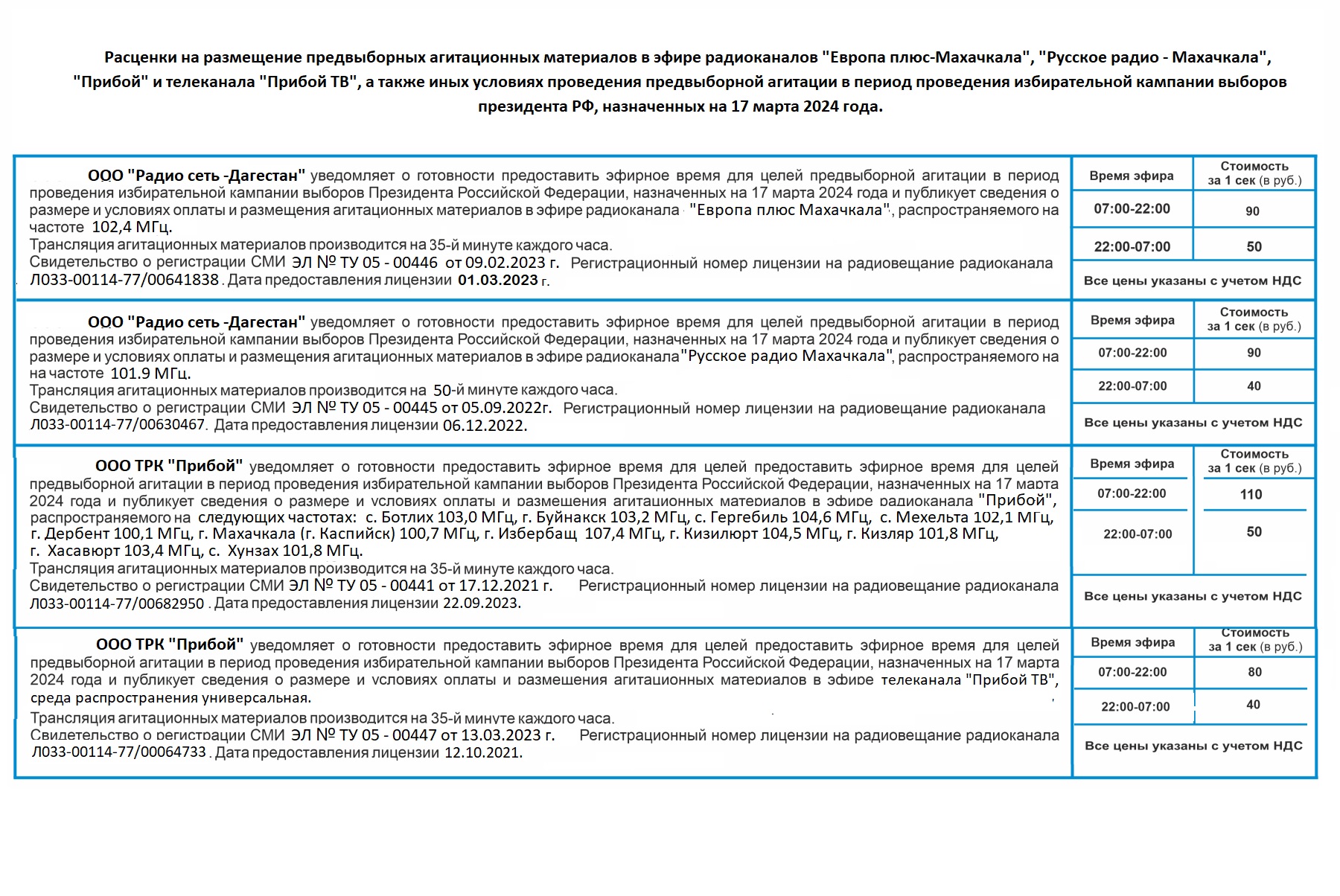 Расценки на размещение предвыборных агитационных материалов на радиостанциях «Европа плюс = Махачкала», «Русское радио — Махачкала», «Прибой» и телеканал «Прибой ТВ».
