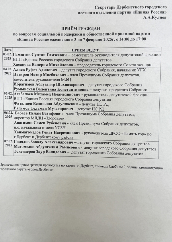 ПРИЁМ ГРАЖДАН по вопросам социальной поддержки в общественной приемной партии «Единая Россия» ежедневно с 3 по 7 февраля 2025г.